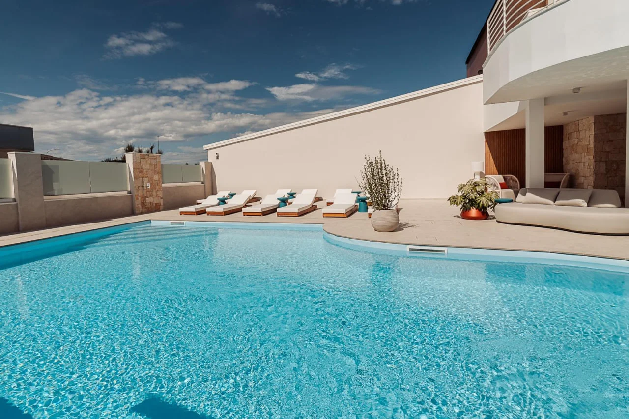Goditi momenti di puro relax nell’elegante piscina del Residence Élite, struttura della stessa proprietà a pochi passi dal Residence De Lucia.